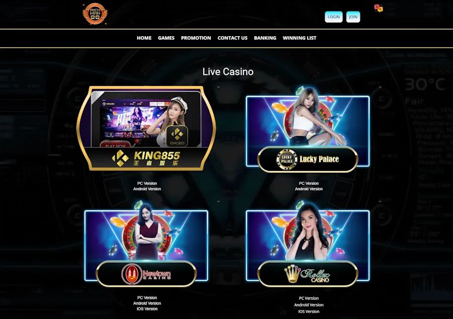 Richman888 is an online casino platform operating in Malaysia that offers slots, live dealer games, sports betting, and fishing games. The platform stands out for its RM1 minimum deposit and focus on Asian players.
